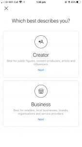 After this step it will take you through and ask you about the type of Business account you want to create. It will ask if you want it Business/Creator, select what type of industry you’d want displayed on your profile. This will proceed to allow you to add contact information and connect your Facebook Page or create one too.